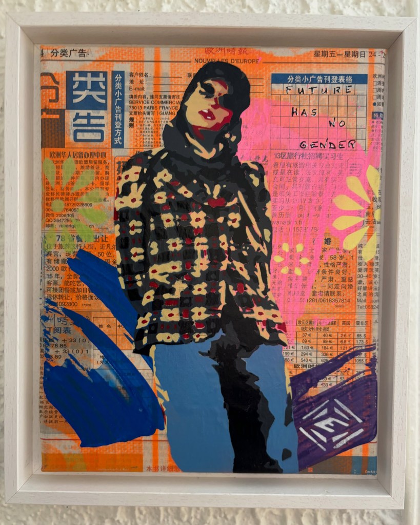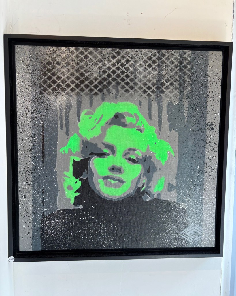 Pics: 1) I adore this one. It’s his daughter!; 2) So cool on so many levels.; 3) A very edgy Marilyn.; 4) Kill Bill-y topless (?) gun girl. 💪; 5) A picture of himself in his military photographer days! “Sentinelle” is a reference to a French army operation in January 2015 in which soldiers were deployed domestically. I think it was in response to Charlie Hebdo.; 6) One of his collages with paint, stencil and Asian newspaper.; 7) David Lynch. Love his grays and green on this and Marilyn.; 8) Beautiful cat, surprising colors.; 9) A couple of pieces on wood…. um… slices (what are those called in English? Def not slices… 🤷🏼♀️)