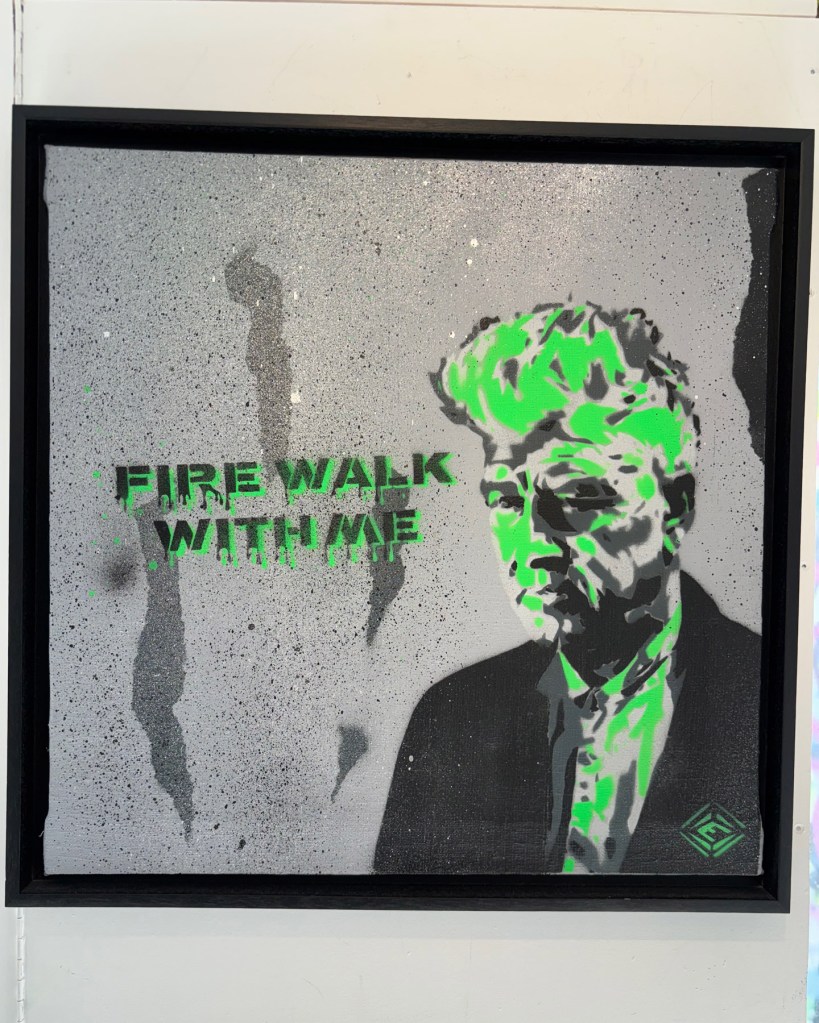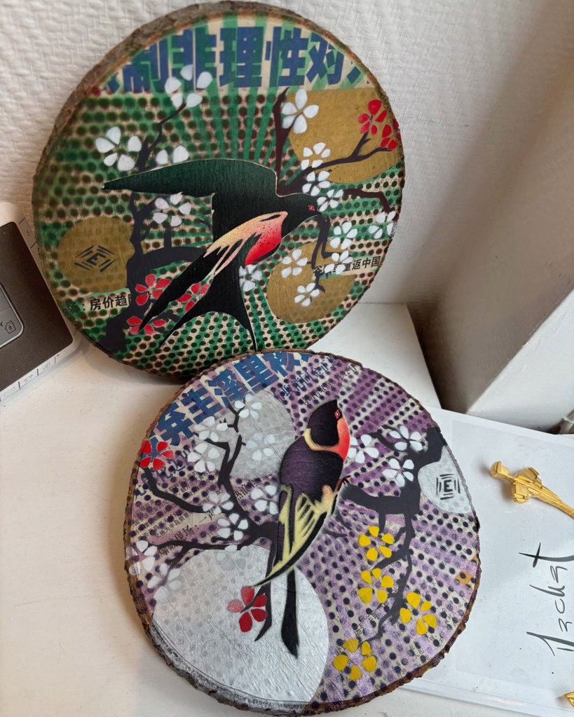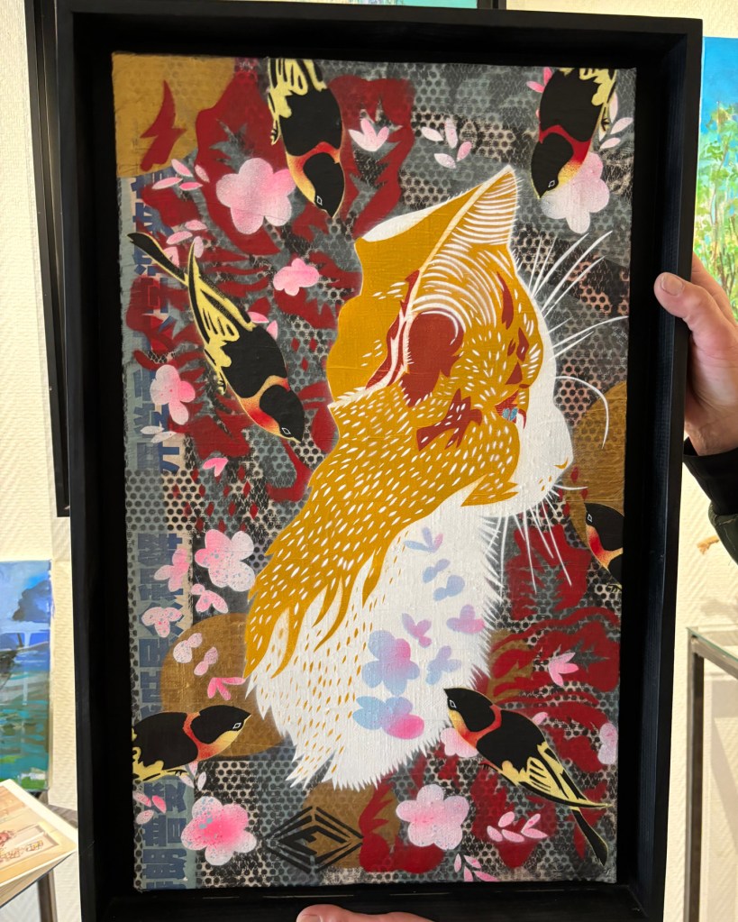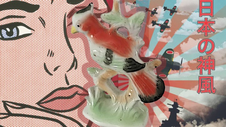A touch of “Occupied Japan” porcelain (a childhood vibe of mine), WWII Japanese propaganda, plus Roy Lichtenstein. In his other work, you’ll find a nod to Shepard Fairey, a dash of Warhol, a pinch of Banksy… And probably other influences I don’t even recognize…