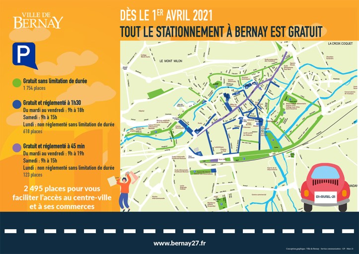 If you do, there’s plenty of free public parking in Bernay. But you might want to get a disque de stationnement because some of these lots are time-limited. Click the image to get to the official PDF.
